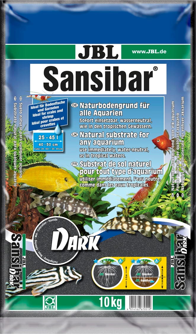 The JBL Zanzibar DARK is a black fine sandy soil with a grain size of 0.2-0.6 mm, which is suitable for freshwater and seawater aquariums, as well as for use in the terrarium.