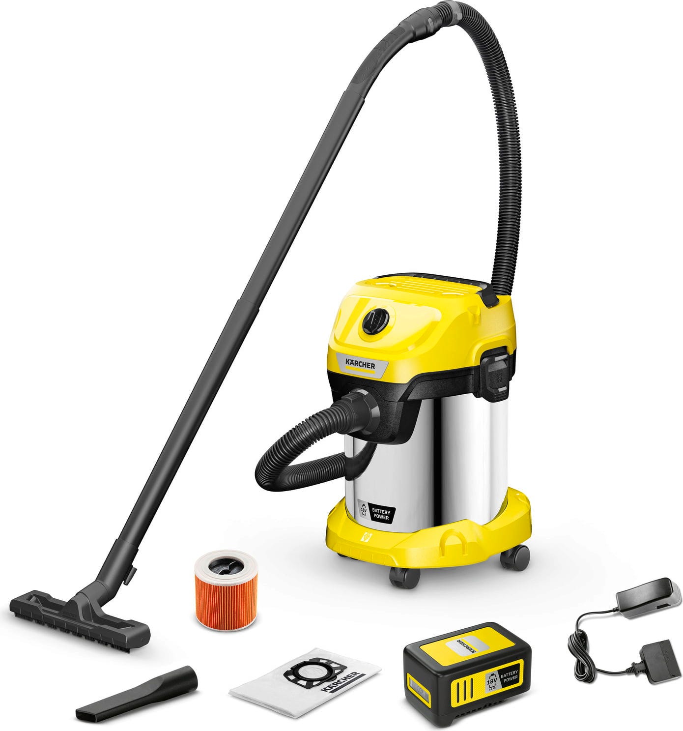The Kärcher WD 3-18 S Battery Set is a premium, cordless wet and dry vacuum that brings heavy-duty performance to the home, garage, and workshop. Powered by the 18V Battery Power platform, it offers complete freedom from cables—making it the ultimate tool for renovation sites without power, garden sheds, or detailing your car out on the driveway.
