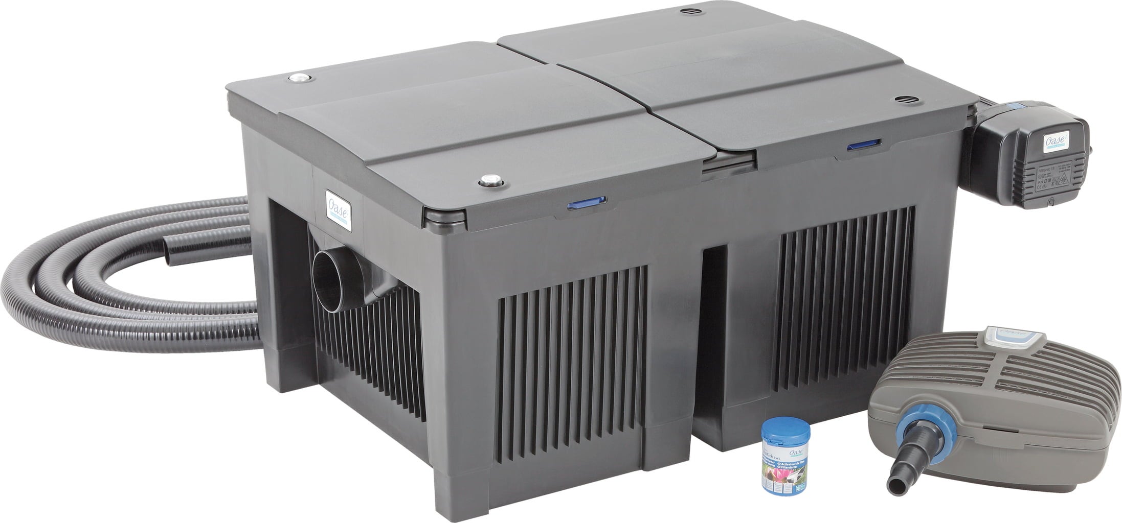 The proven cleaning handles of the Oase pond filter allow easy cleaning of the filter foam without dismantling. This Oase Set is the ideal introduction to the OASE Aquamax filter pump, which is optimally matched to the filter.